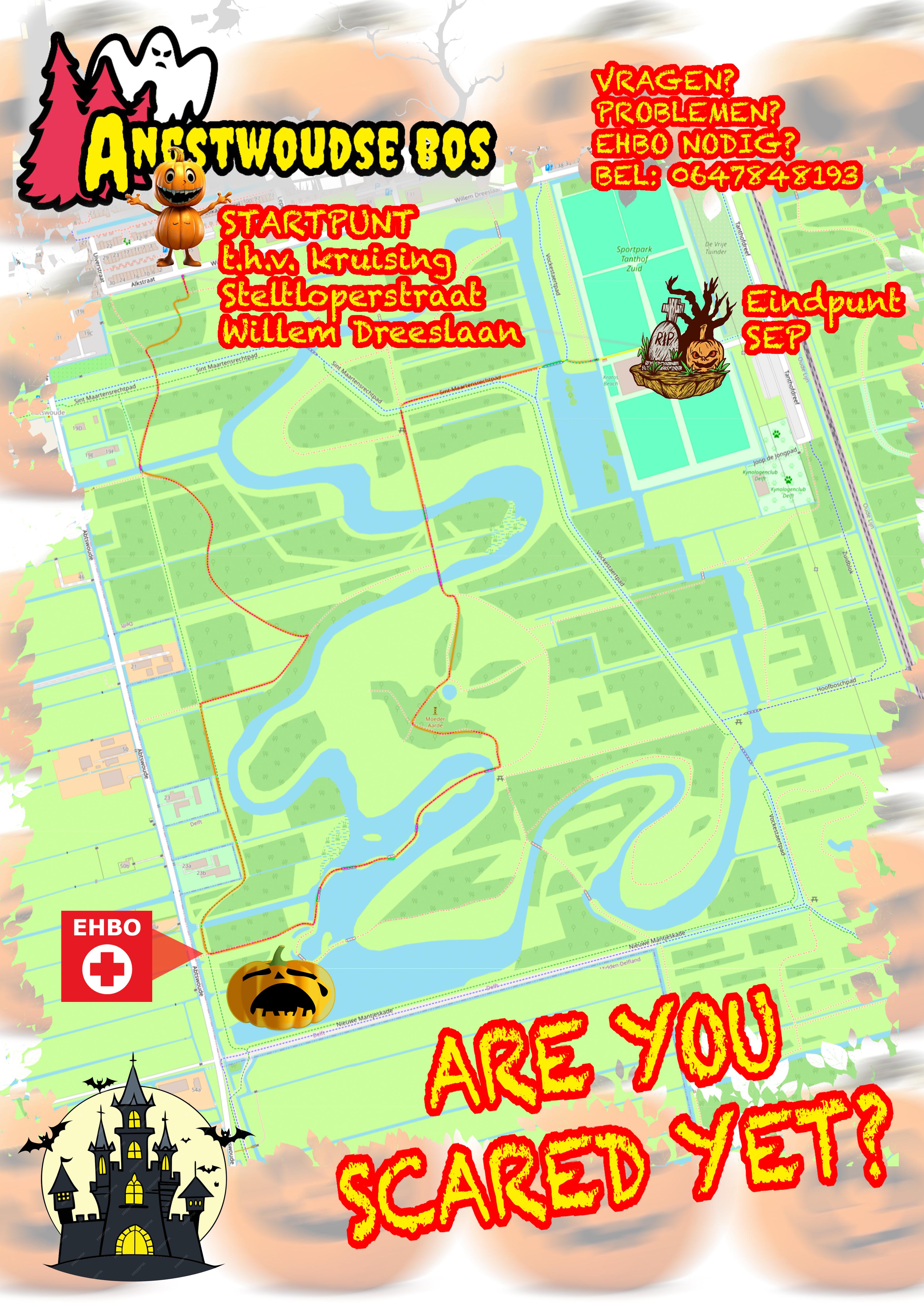 Ook dit jaar organiseren we weer 2 spooktochten. De korte, minder enge tocht (Happy Halloween) start vanaf 17:00 met als startpunt Waterspeeltuin ingang Geitenkamp. De langere, hele enge tocht (Are You Scared Yet?) start vanaf 18:00 en heeft als startpunt de ingang van het bos ter hoogte van de kruising Steltloperstraat / Willem Dreeslaan. Let op de geadviseerde leeftijdsgrens: de enge tocht kan écht eng zijn!